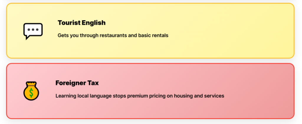 To stop paying the ‘foreigner tax,’ you need the local language. I personally use LingQ to learn languages because it focuses on input, which is exactly how you learned your first language as a child.