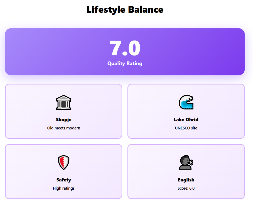 In North Macedonia, you can rent a nice apartment for $400 a month, and dining and services stay among the lowest in Europe. That’s why in the Cost of Living factor, North Macedonia scores a 9.5.