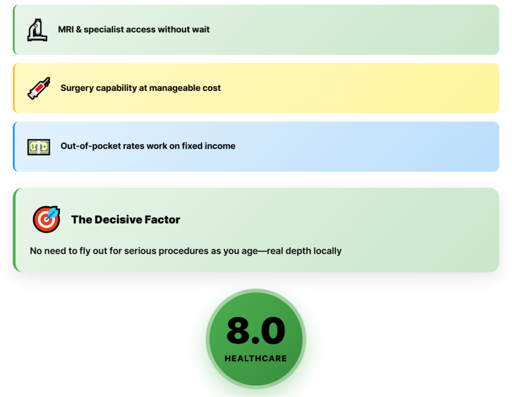 Quality of life comes in at 7.5, driven by an HDI of 0.810 and a Mediterranean climate that many retirees find comfortable. Healthcare is the weak link.