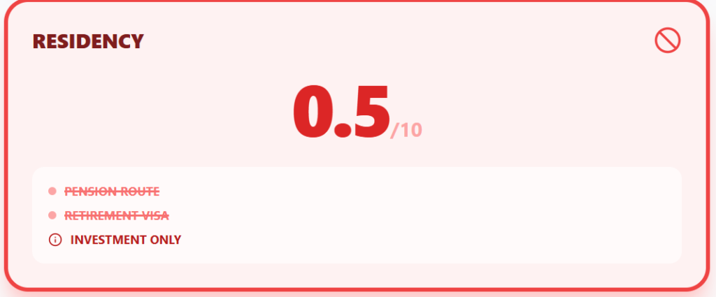 The “independent means” path is extremely restrictive, and residency options focus on EEA nationals, skilled workers, or close family ties. The Ease of residency gets just a 0.5.