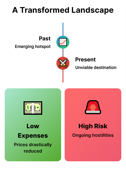 Ukraine was once a rising hub for digital nomads and retirees seeking value. Today, active conflict drastically decreases the economic dynamics and the quality of life an expat could expect there, regardless of the price.