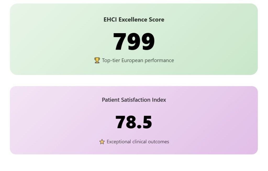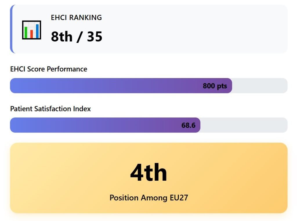 The EHCI score of 799 ranks Austria in the top 10 of all European countries. The Numbeo rating of 78.5 reflects excellent clinical care and high patient satisfaction.