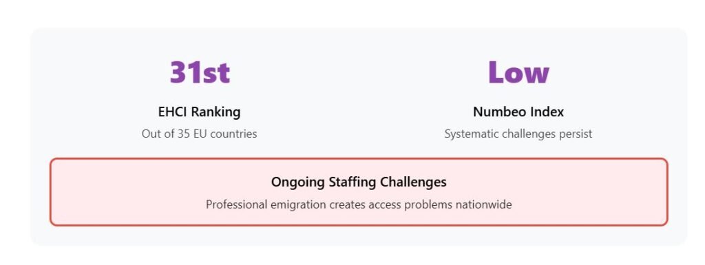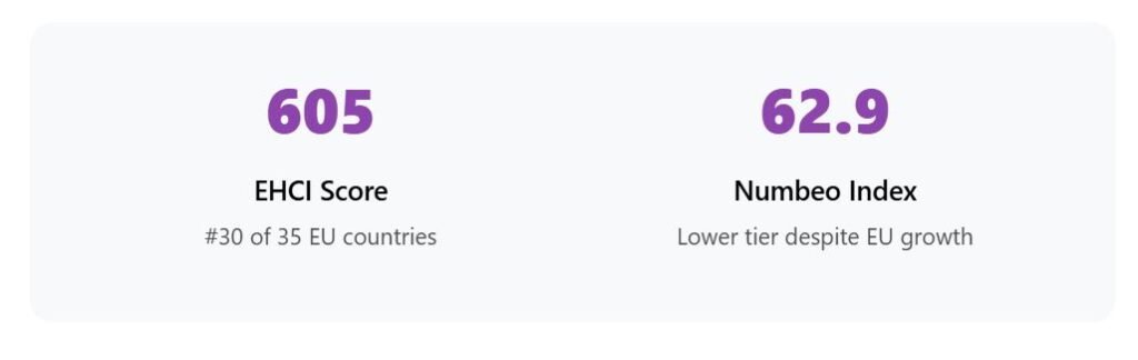 The EHCI score of 549 ranks Romania 34th out of 35 European countries measured — the lowest in the EU. The Numbeo rating of 56.8 is just above Hungary but below most EU countries.