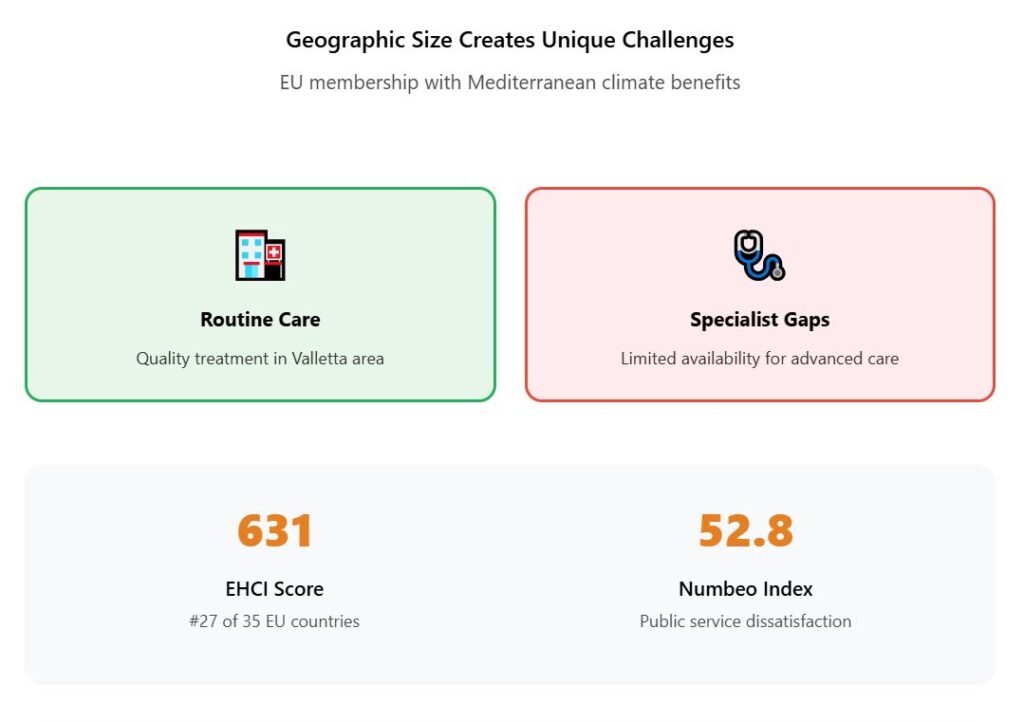 Malta offers EU membership, English-language healthcare, and Mediterranean climate, but the small size creates unique healthcare delivery challenges.