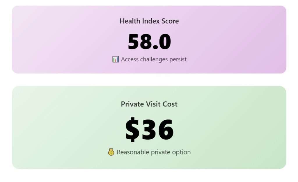 The growing private sector provides alternatives to public system bottlenecks, with private GP visits costing US$65. Specialist shortages in certain areas create access problems that force patients to wait or travel to larger cities.