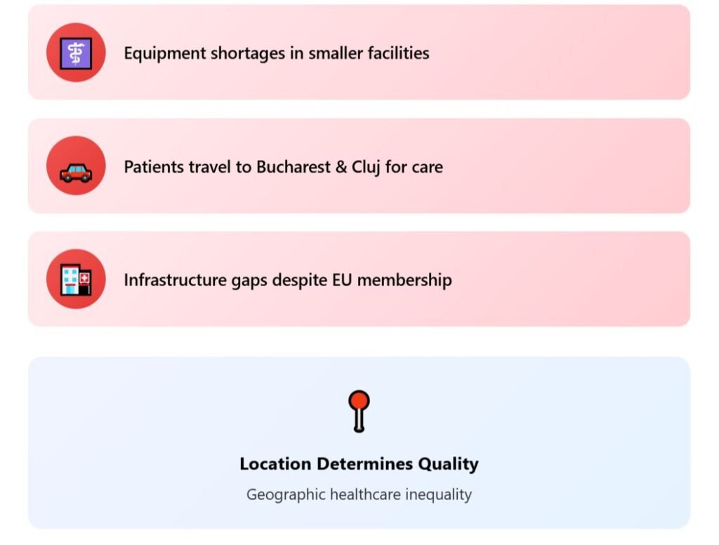 Even affordable private care struggles when hospitals lack modern equipment and specialists concentrate in major cities like Bucharest and Cluj, leaving smaller towns underserved.