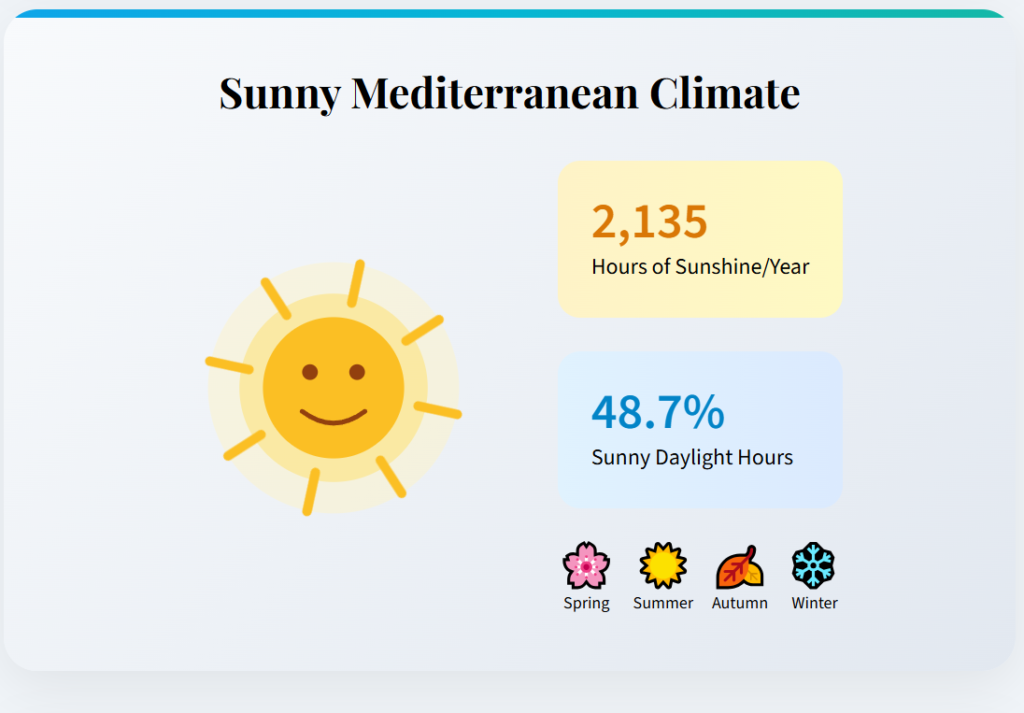 The local weather is famously warm and dry, treating residents to a glorious 332 hours of sunshine per month during the peak summer season.