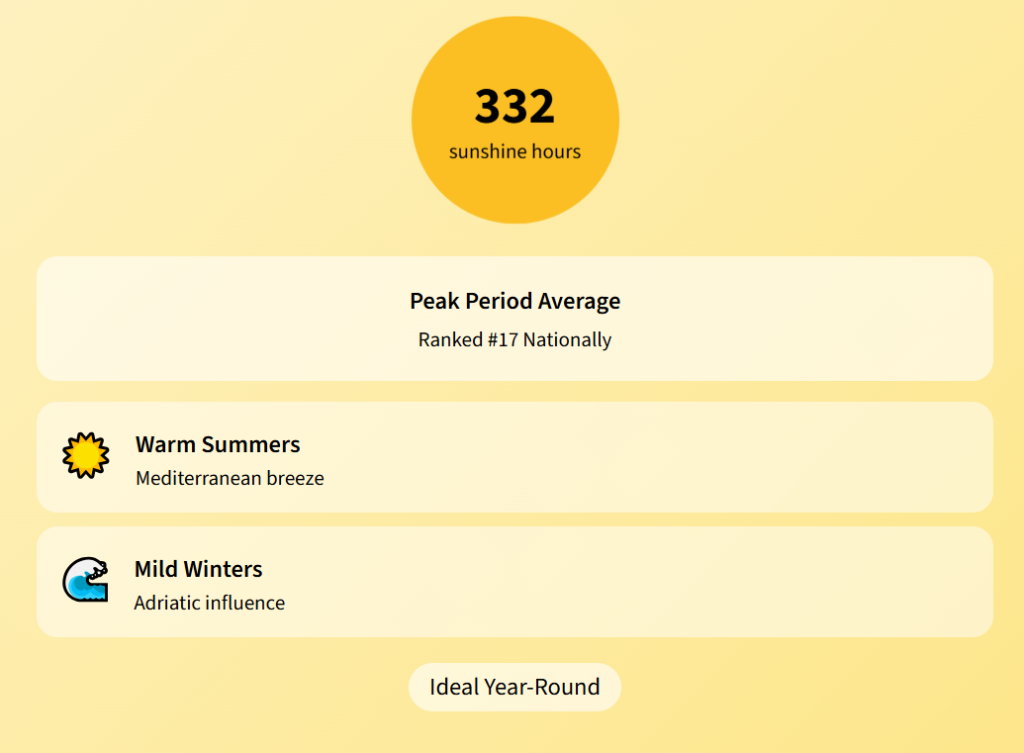 If you ever want to visit Split for a quick weekend getaway or explore a remote Greek island, you can simply walk onto a departing ferry. The weather is consistently pleasant, offering residents an impressive average of 2,135 hours of sun annually. While the winters are certainly cooler and slightly wetter than the deep south, the climate still secures a respectable 7 out of 10.