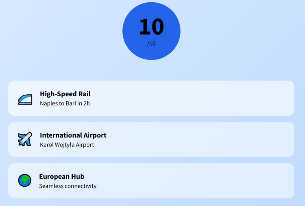 Additionally, the local Karol Wojtyła Airport efficiently handles a wide variety of direct international flights across Europe. Because of this flawless, multi-tiered connectivity, we proudly award Bari a perfect 10 out of 10 for infrastructure