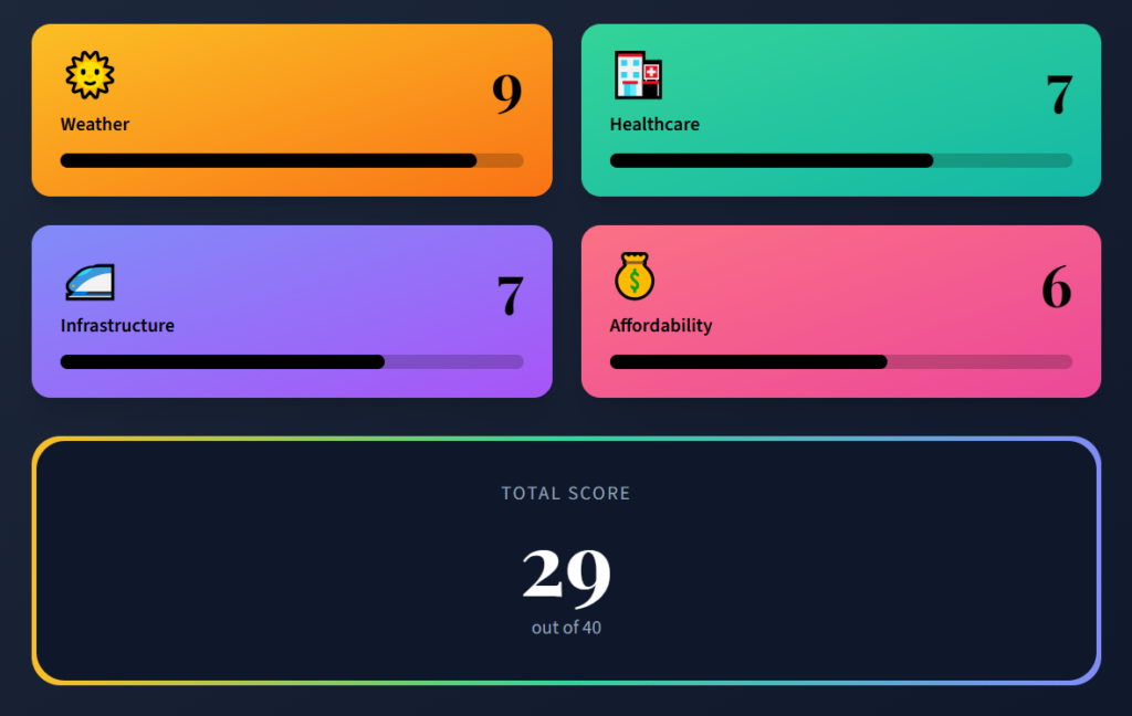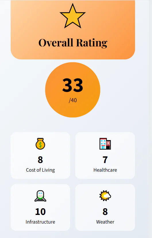 Ultimately, Pescara earns a 9 for cost of living, an 8 for healthcare, a 7 for infrastructure, and an 8 for weather, securing a grand total of 32 points. This makes it an incredibly strong, budget-friendly option for any prospective expat.