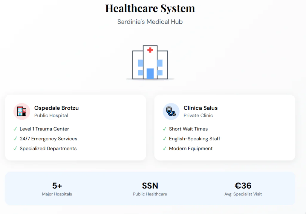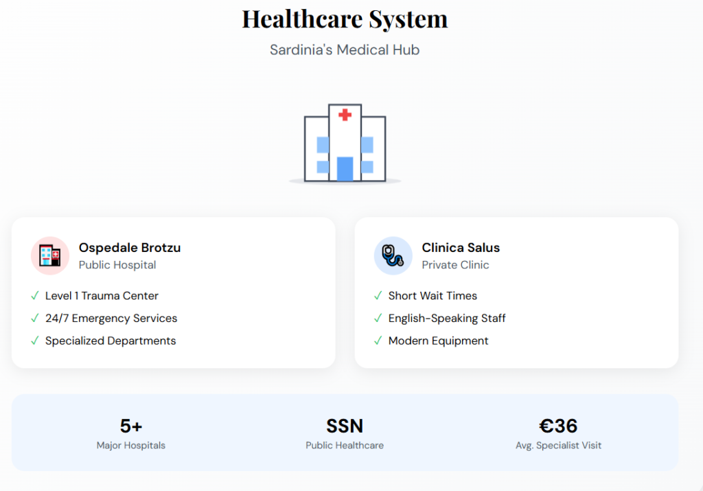 Regarding medical infrastructure, the public Ospedale Brotzu expertly handles complex trauma cases and highly specialized surgical procedures. There are also multiple top-tier private clinics available for expats who prefer faster scheduling of specific elective treatments. Most routine care is handled locally, and even if you require something incredibly specialized, you are always just a quick flight away from Rome’s world-class facilities.
