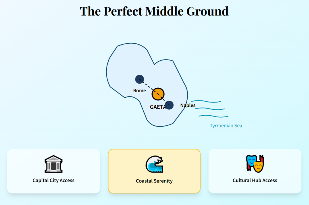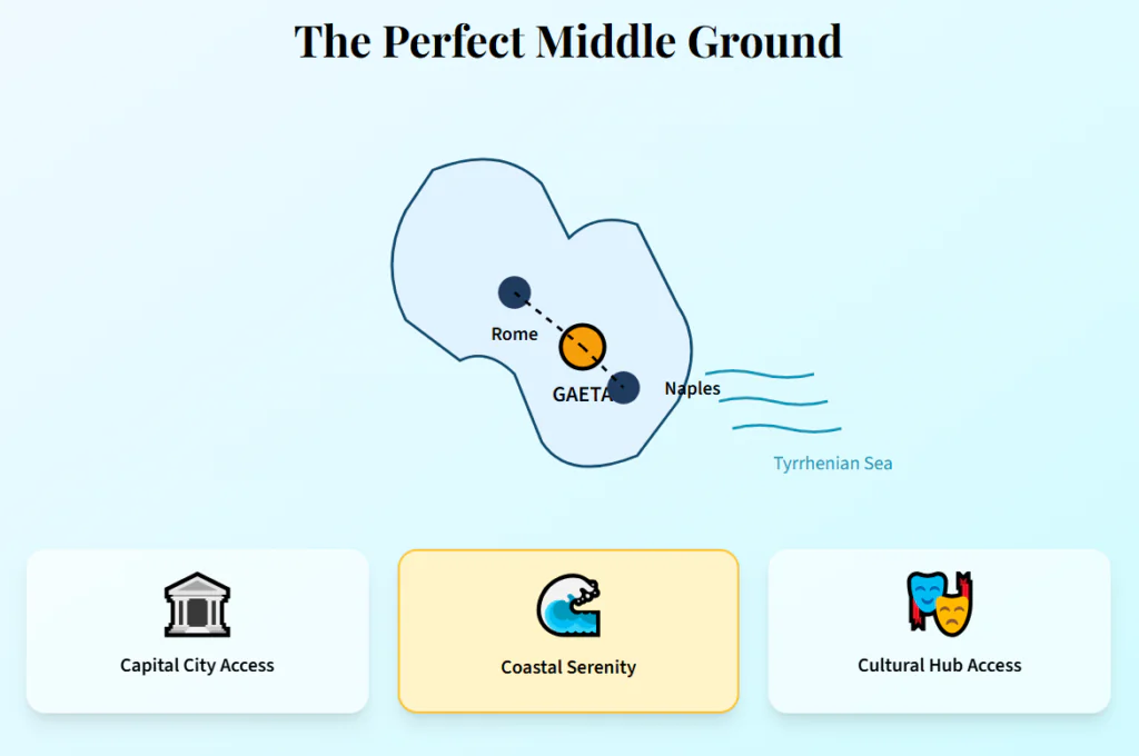 Gaeta is an absolutely idyllic destination that most Americans have never even heard about. It is a charming coastal town of roughly 19,000 people located directly on the beautiful Tyrrhenian Sea, sitting perfectly between Rome and Naples. It is small enough to feel incredibly peaceful, yet it remains strategically positioned between two major metropolitan powerhouses.