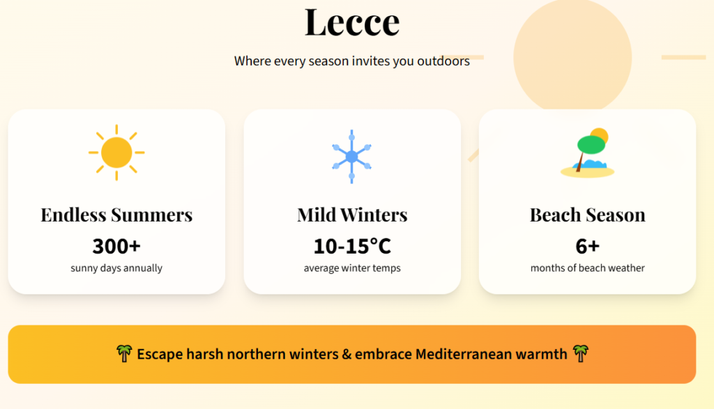 Now, for the crucial weather data you have undoubtedly been waiting for: Lecce consistently records some of the absolute highest annual sunshine hours in all of Italy. The local southern winters are so incredibly mild that you will rarely ever need to pull out a heavy winter coat. If you are specifically seeking a highly active, sun-drenched, year-round outdoors lifestyle, this is unequivocally the absolute perfect place for you.