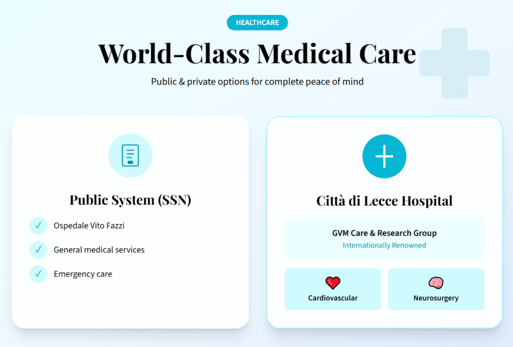 Medically speaking, the highly respected Città di Lecce Hospital specializes heavily in advanced cardiovascular surgery and complex interventional cardiology. For highly reliable, everyday routine care, residents have immediate access to the expansive Ospedale Vito Fazzi public facility. Furthermore, many local expats and wealthy retirees simply prefer to utilize the region’s excellent private clinic options to entirely skip any frustrating public wait times.
