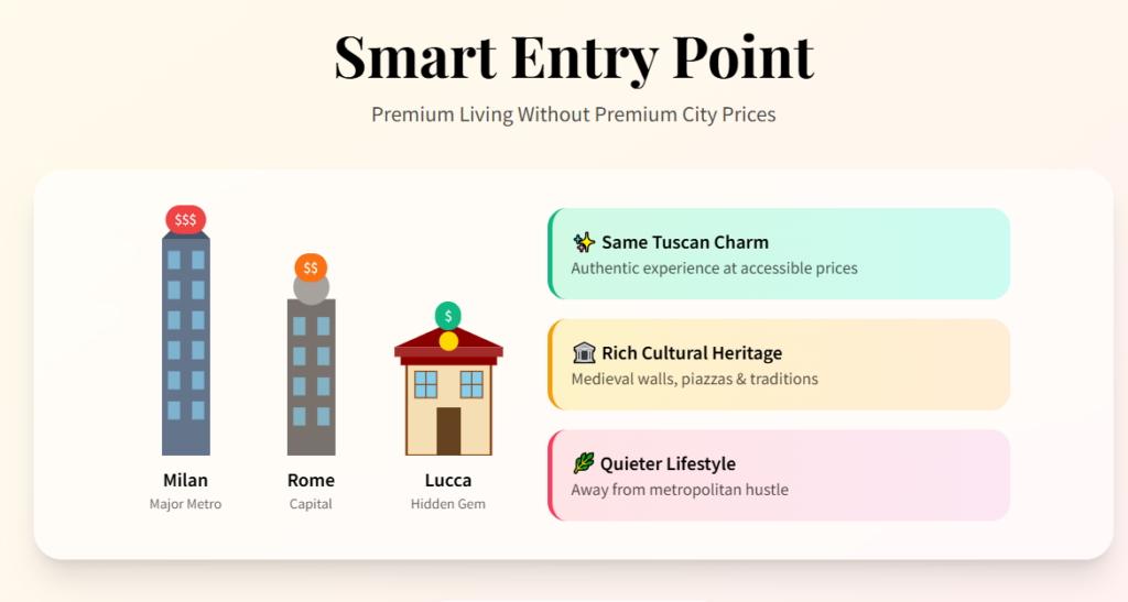 Regarding the climate, Lucca is situated in Tuscany, meaning it can be quite humid, occasionally foggy, and you will definitely see more rain than in the south. However, if you desire a refined Tuscan lifestyle paired with excellent healthcare and strong international connections, Lucca absolutely delivers. You are simply paying a slightly premium price for that exceptional quality of life.