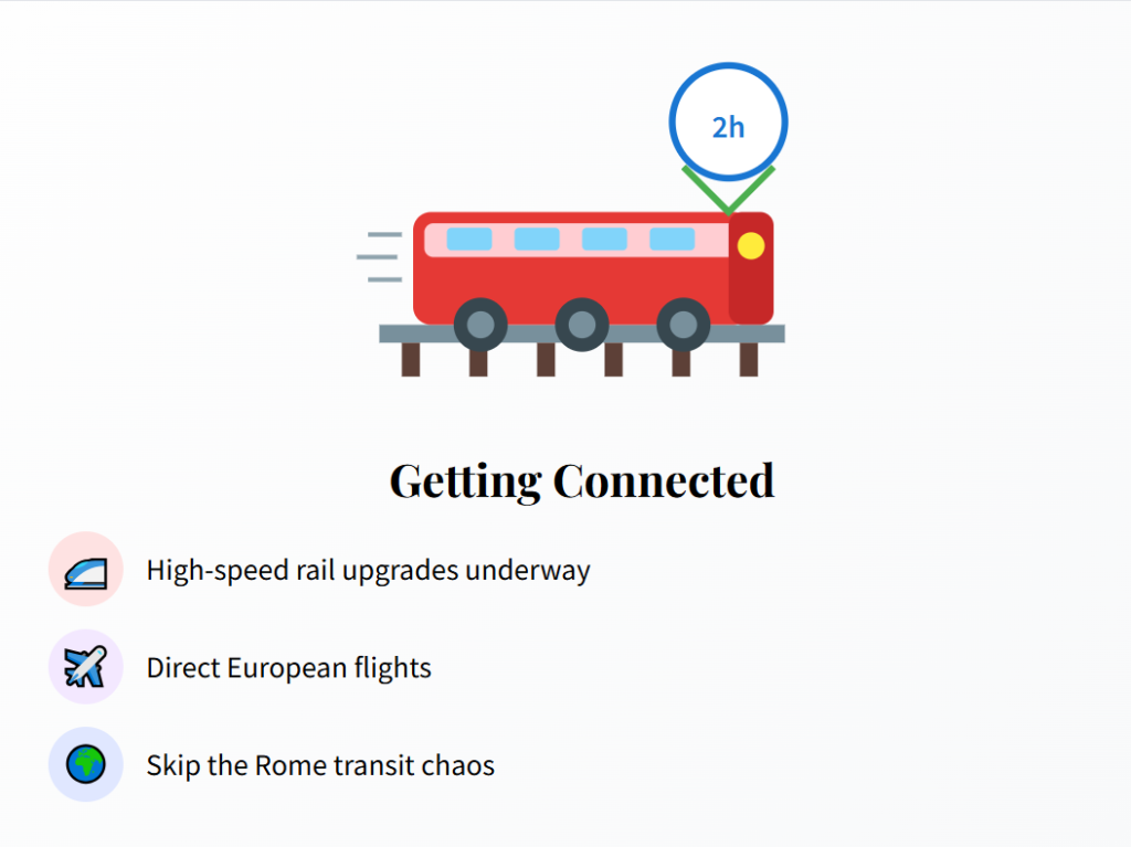 Because of these upgrades, you can now comfortably reach Rome in just four hours or speed over to Naples in a mere two and a half hours. This spectacular blend of air and rail connectivity comfortably secures an elite infrastructure score of 9 out of 10.