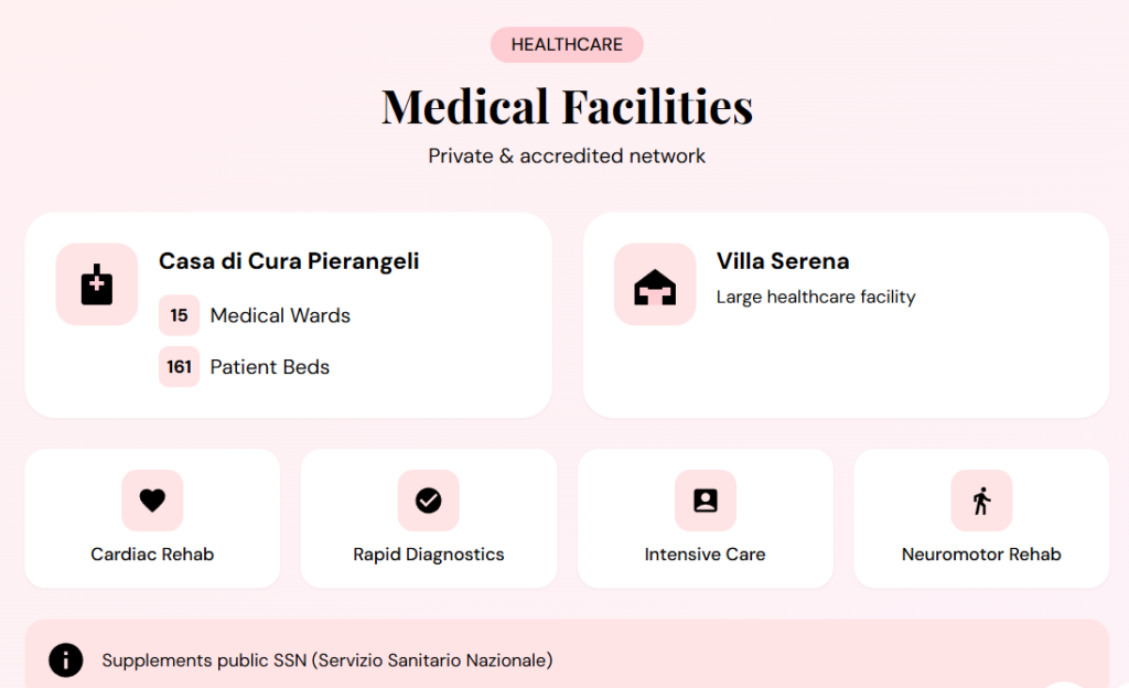 The main drawback with smaller coastal towns is that you do not usually get a massive hospital right next door. On the other hand, the immediately adjacent city of Formia features excellent private clinics like Casa del Sole that expertly handle multi-specialty care. On top of that local access, you are still only a quick one-hour journey away from Rome’s world-class medical facilities.