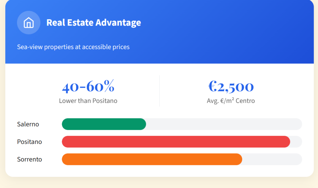 Salerno is the ultimate, budget-conscious alternative to the famously expensive Amalfi Coast. By settling here, you get to experience the exact same dramatic cliffs, breathtaking Mediterranean views, and luxurious coastal lifestyle as you would in ultra-pricey Positano. Best of all, you secure all of those incredible geographic benefits for an absolute fraction of the standard tourist price.
