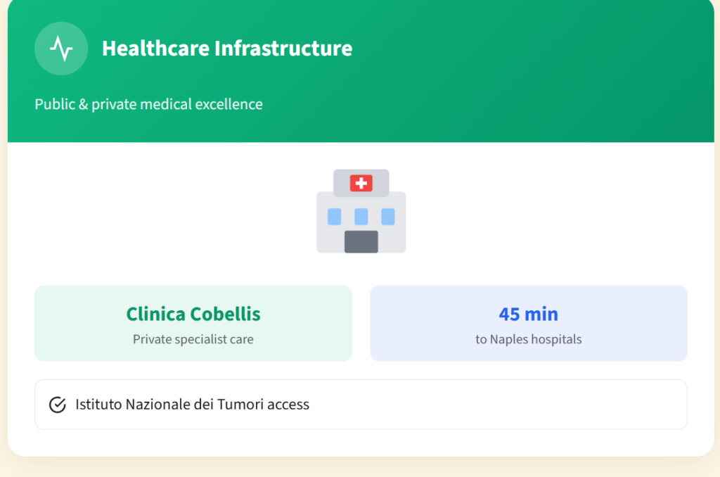 In terms of healthcare infrastructure, Salerno hosts plenty of excellent private clinics to handle standard routine medical needs. More importantly, you are located just a quick forty-minute drive from Naples, which stands as the third-largest city in the entire Italian nation. Naples boasts the prestigious Istituto Nazionale dei Tumori, which is a major cancer research center universally recognized among the highest-evaluated medical institutions in Italy, granting you immediate access to complex surgical care and specialized university treatments.