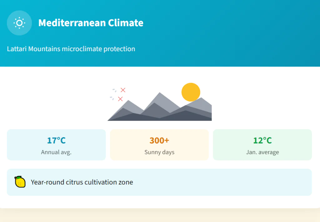 These towering peaks physically shield the entire town from harsh northern winds, ensuring that the local temperature remains remarkably moderate year-round. You will instantly notice fragrant citrus trees growing everywhere, which proves the climate is warm enough for delicate Mediterranean agriculture yet protected enough to stay comfortable.