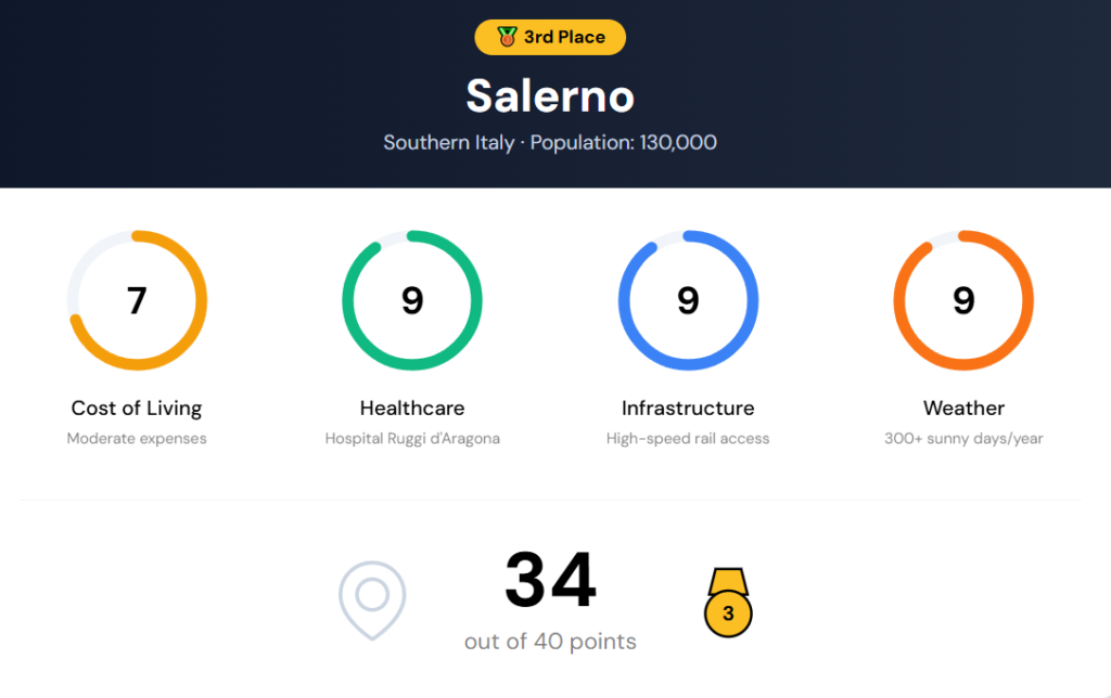 Salerno performs exceptionally well across all four of our core data indicators. It proudly earns a 7 for cost of living, a 9 for healthcare, a 9 for infrastructure, and a 9 for weather. With an outstanding total of 34 points, this coastal gem easily secures our highly coveted third-place position.