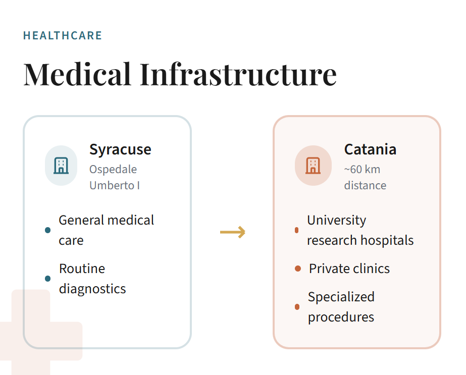 While the immediate local healthcare is merely adequate, Syracuse boasts the massive geographic advantage of being just fifty minutes away from the larger city of Catania. Catania features several major university research hospitals and elite private clinics that easily handle highly complex, specialized medical treatments.