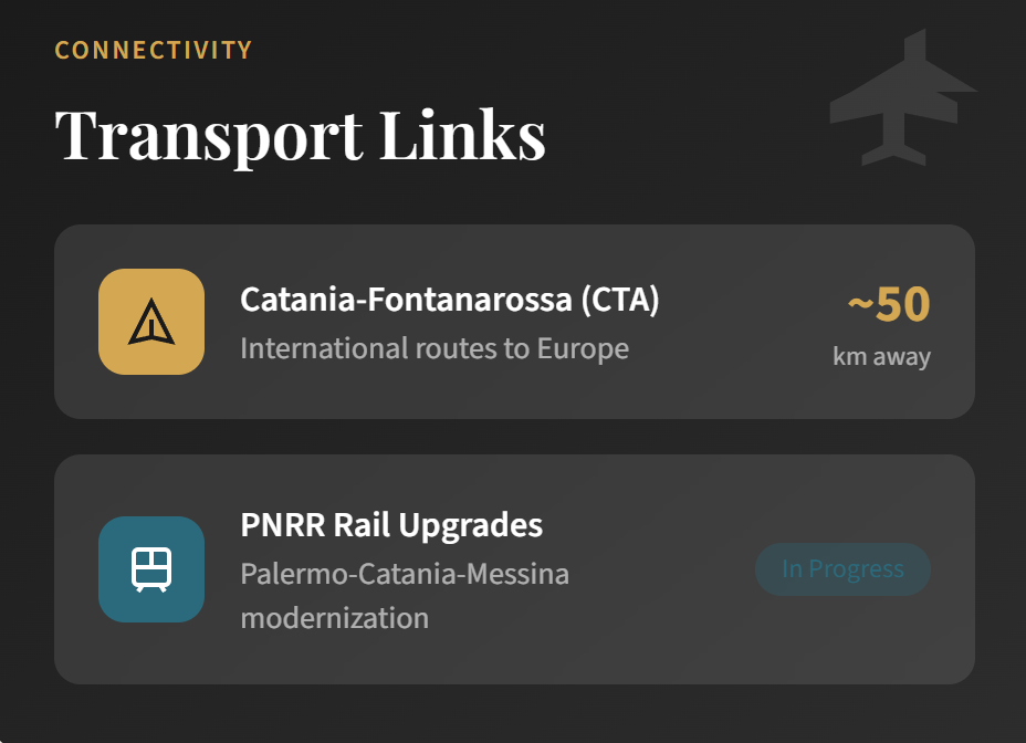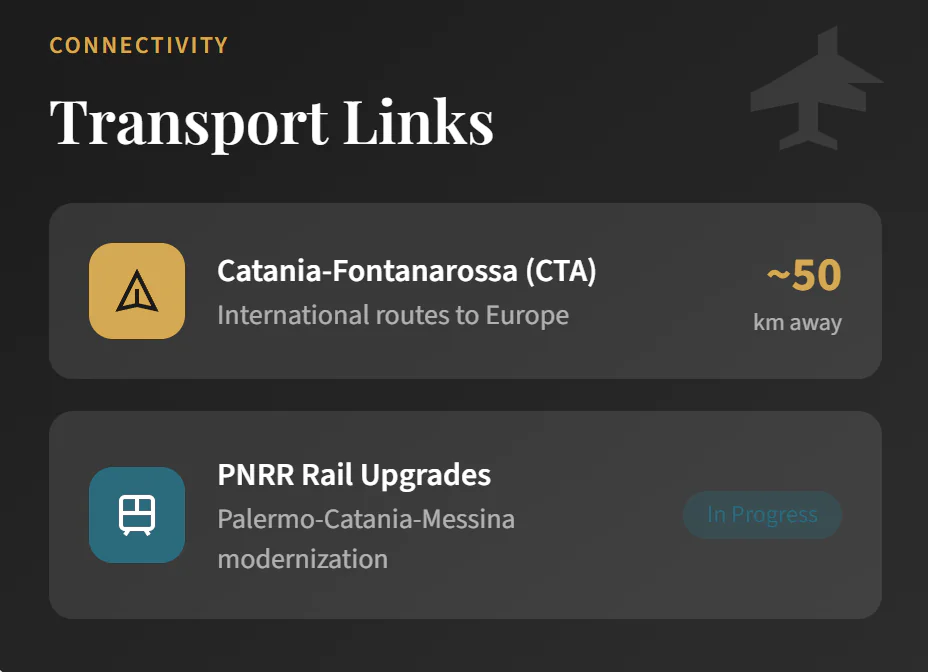 The island’s broader infrastructure is actively being transformed right before our eyes. The massive Catania-Fontanarossa Airport is located just 60 kilometers away, consistently providing direct international flights to major hubs across Europe and far beyond. Additionally, the Italian government is currently pouring an unprecedented amount of money into upgrading Sicily’s antiquated railway network through the PNRR national recovery fund.