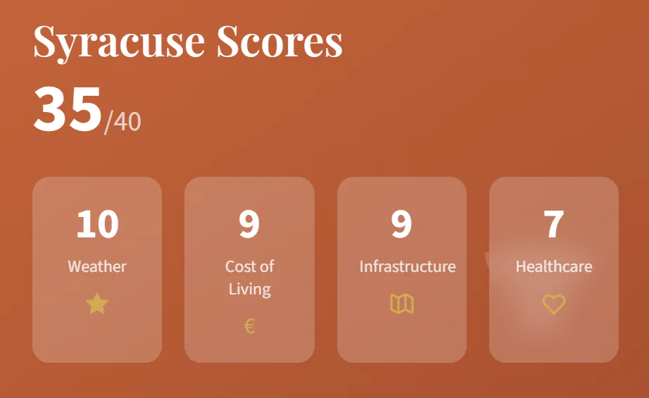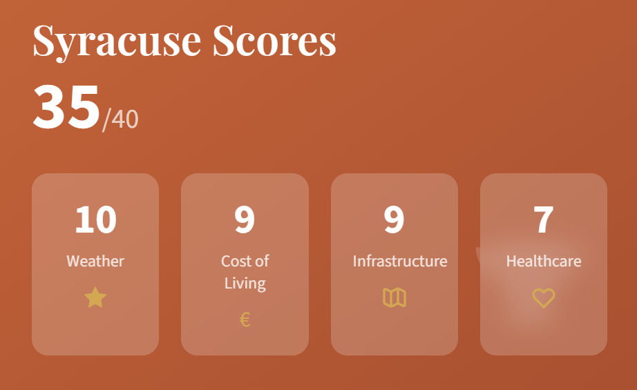 Because your money stretches so incredibly far on this island, Syracuse easily secures a near-perfect 9 out of 10 for cost of living.