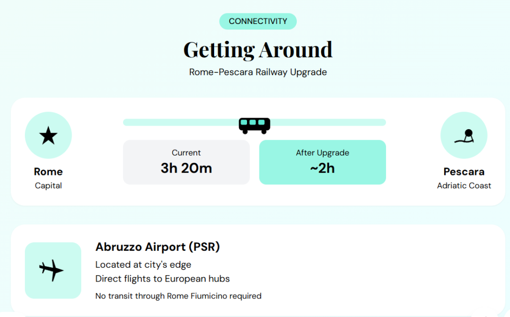 Pescara also performs exceedingly well regarding travel connectivity, as the convenient Abruzzo Airport sits very close to the central city limits. This allows you to completely skip the logistical nightmare of navigating Rome’s massive Fiumicino airport for regional flights. Furthermore, the vital Rome-Pescara railway line is currently undergoing a massive upgrade that will soon drop the cross-country travel time from over three hours down to just two, earning it an infrastructure score of 7 out of 10.