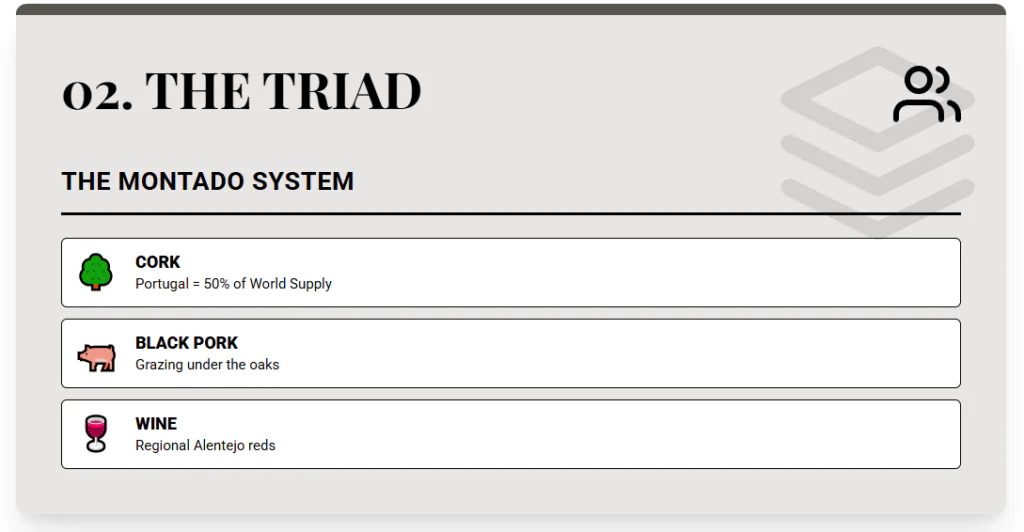 The core farming cultures are cork, black pork, and wine. You harvest cork about every nine years. One harvest brings a large cash injection with relatively low ongoing work; like a fixed income bond at its maturity.