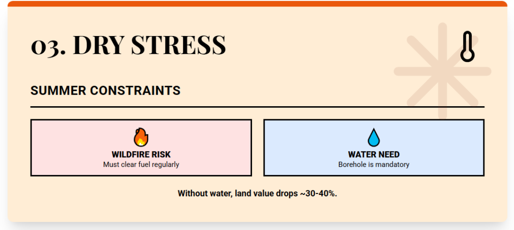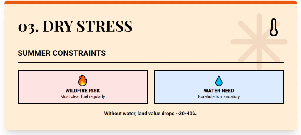 Heat and water are the main constraints. Summers run hot and dry, and during dry years, it is necessary to have alternative water sources. Dense vegetation and dry weather also lift wildfire risk, which raises insurance costs and forces regular fuel clearing.