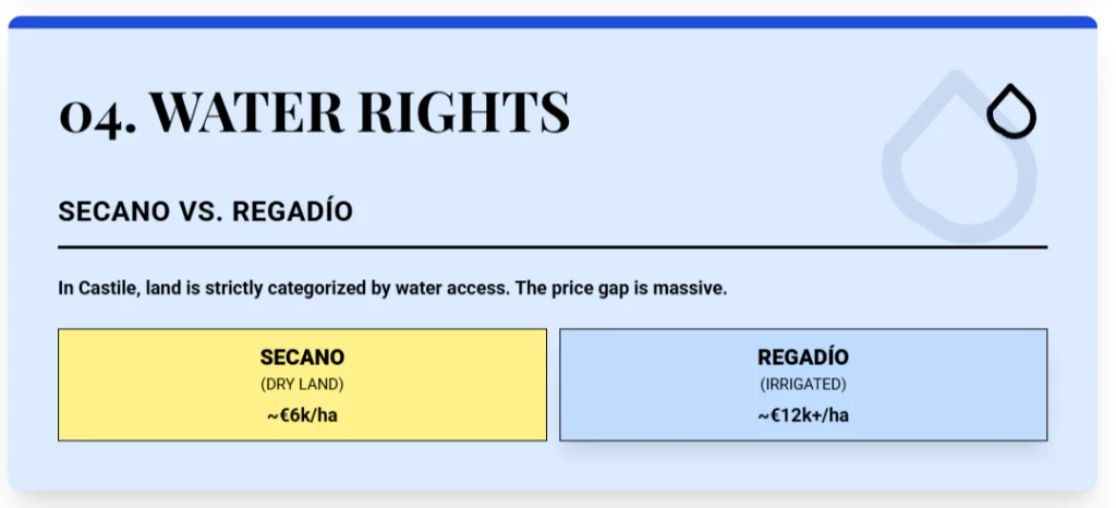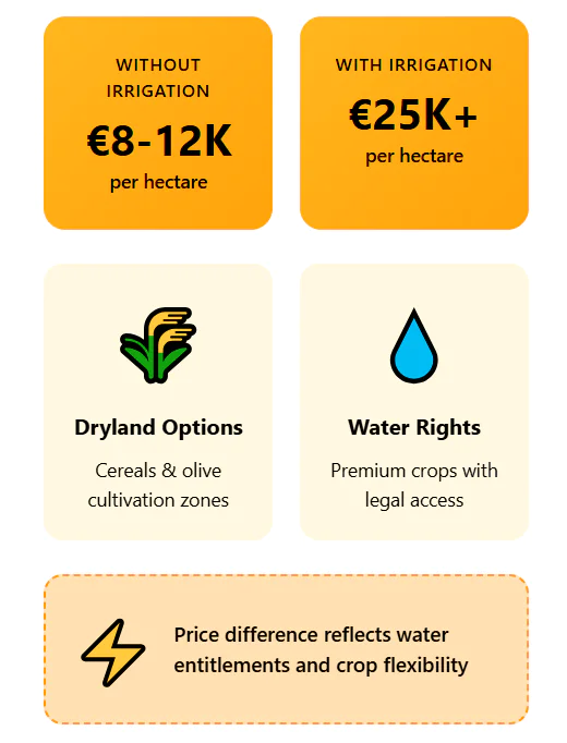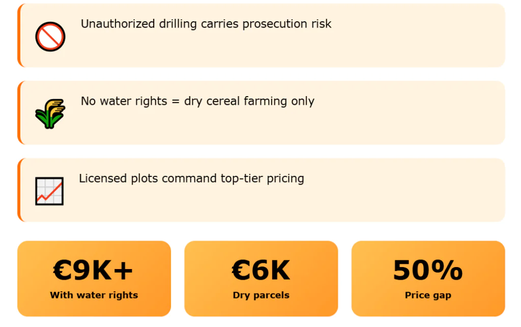 Aquifers here stay under pressure. New wells face strict limits, and illegal drilling carries real risk. Land without formal water rights can be hard to use for pistachios or vines at scale, and that pushes its value down toward dry cereal use only.