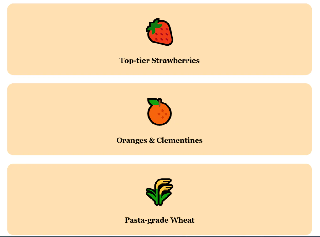 On the coastal strip near Metaponto, farms focus on strawberries and citrus. The Metaponto area is known for strawberries that rank among the best in Italy, plus oranges and clementines in the same coastal belt. Inland, the hills move into durum wheat.