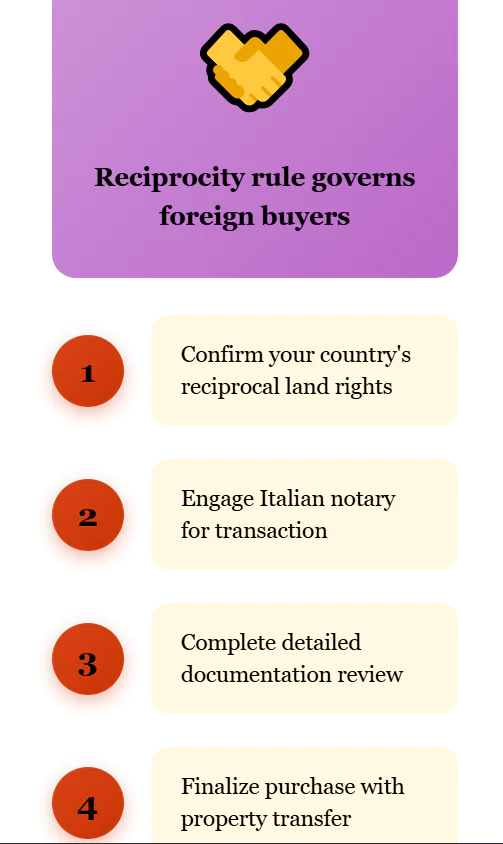 Hilly blocks make mechanization harder, raise fuel use, and slow every field operation. For non‑EU buyers, Italy uses the reciprocity rule. If people from your country can buy land in Italy, you can buy Italian land.