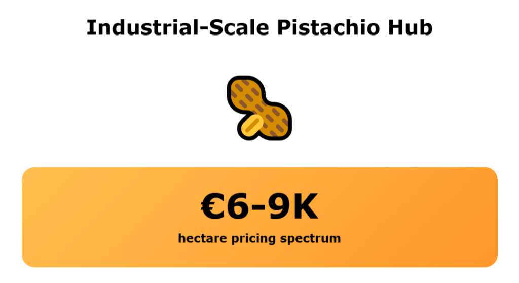 Land with productive pistachio trees can raise the land prices to €9,000 per hectare and beyond. And that is because Pistachios use less water than almonds and sell at high prices. Vineyards add another layer.