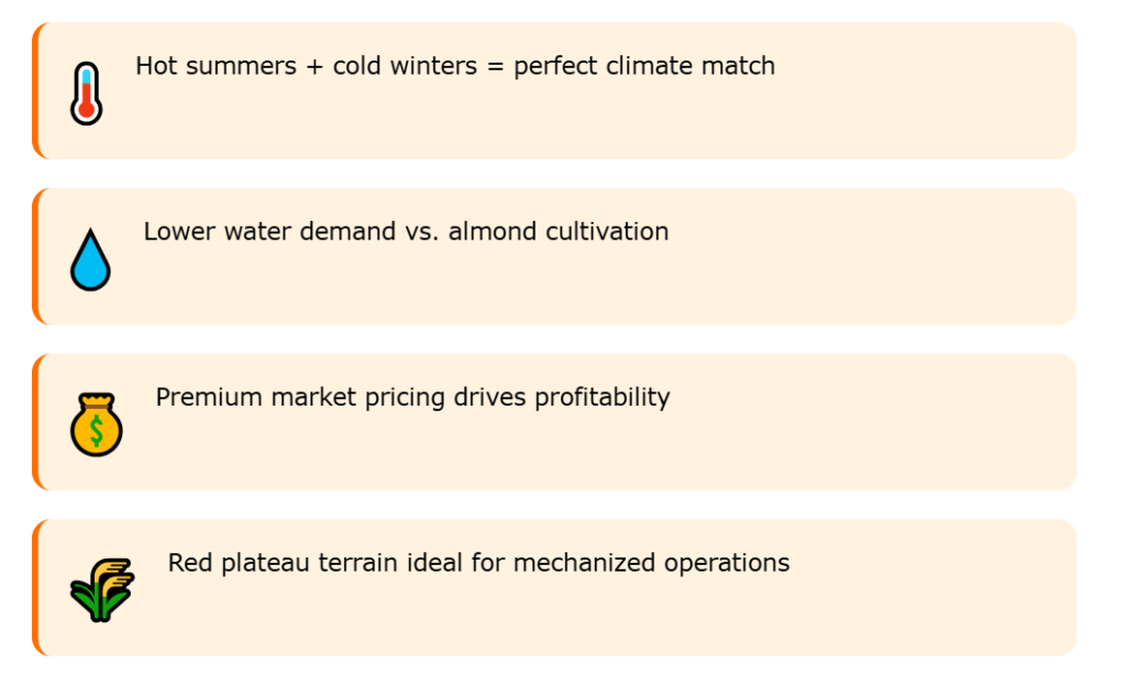 This region quietly turns hundreds of hectares of dry plains into pistachios, vines, and cash flow.