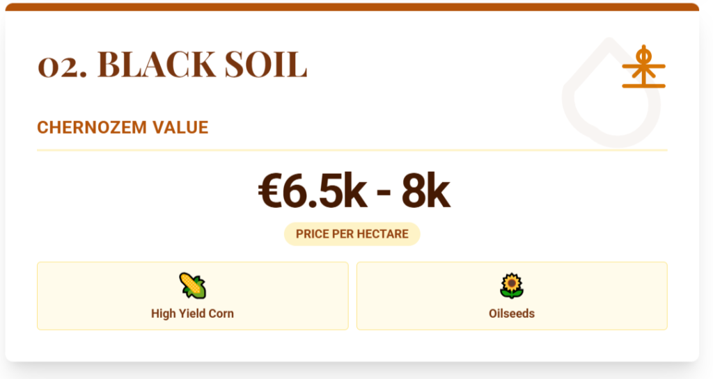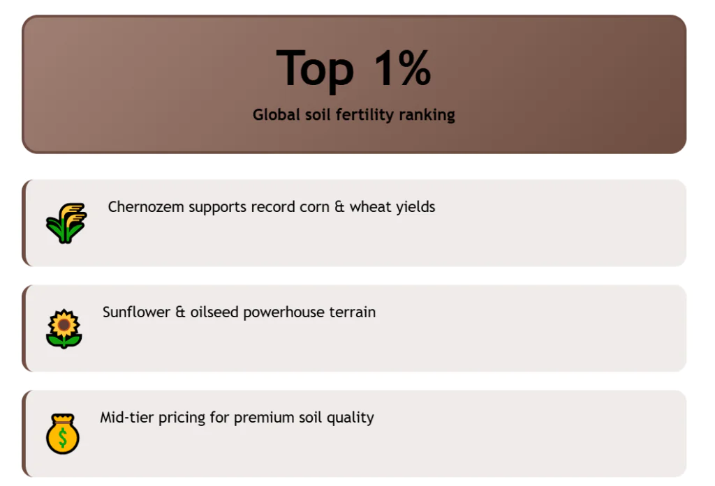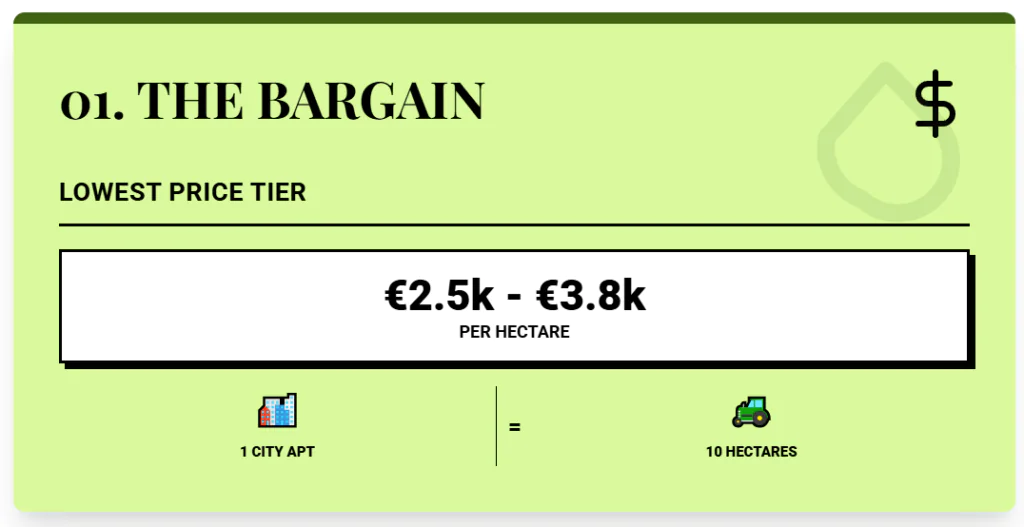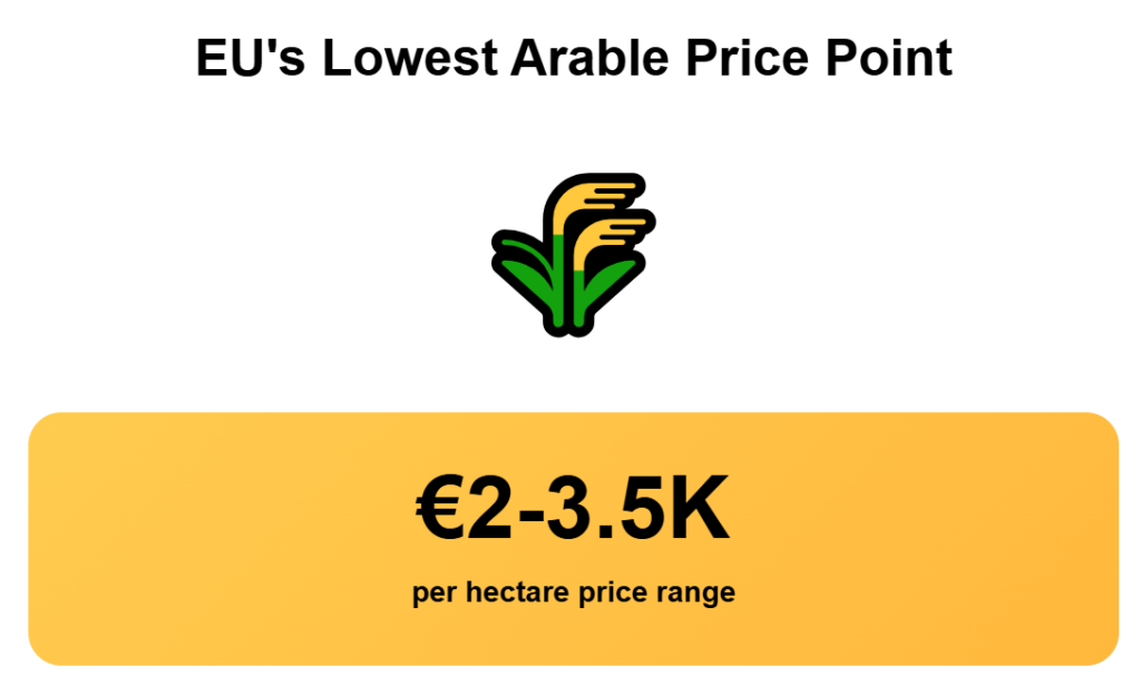 Compared with other Bulgarian regions, Dobrich has better soils, closer access to ports, and stronger integration into export routes through the Danube and Black Sea. At €2,000 per hectare, Bulgaria is the price floor of this ranking, but believe it or not, you can go cheaper in Europe if you are willing to take on more risk.
