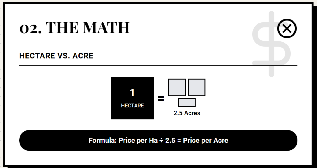 - Second, price per hectare. Remember that one hectare is the same as 2.5 acres, so to have the price per acre, just divide the value we will give you by 2.5.