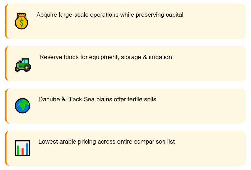 At that cost, you can buy scale and still keep capital free for machinery, storage, or irrigation. All that on the Danube and Black Sea plains, with very productive soils. The main farming cultures are sunflowers, wheat, and corn.