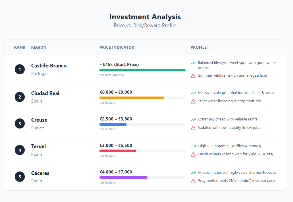 The higher we go in the ranking, the more the numbers line up in your favor. Stay to the end, because the top three regions combine low prices, fertile land, and one of the easiest buying processes in Europe.