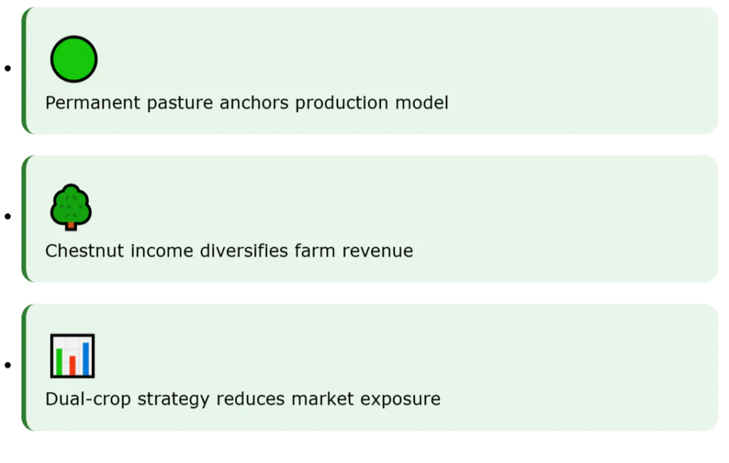 Limousin cattle are France’s flagship beef breed. Most farms use grass and hay from permanent pasture, with some maize or other forage. Chestnut groves add a second line of income and diversify risk.