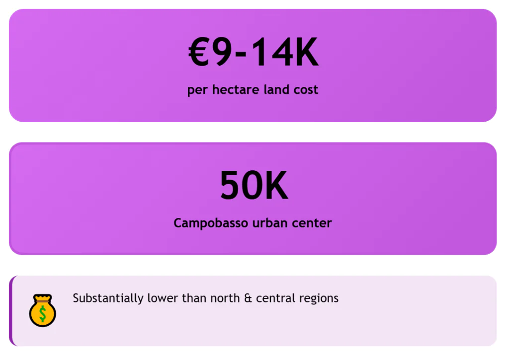 The main urban center is Campobasso, with around 50,000 people. Land prices there usually range from €9,000 to €14,000 per hectare, well below many parts of central and northern Italy. Old olive groves produce high‑quality oil.