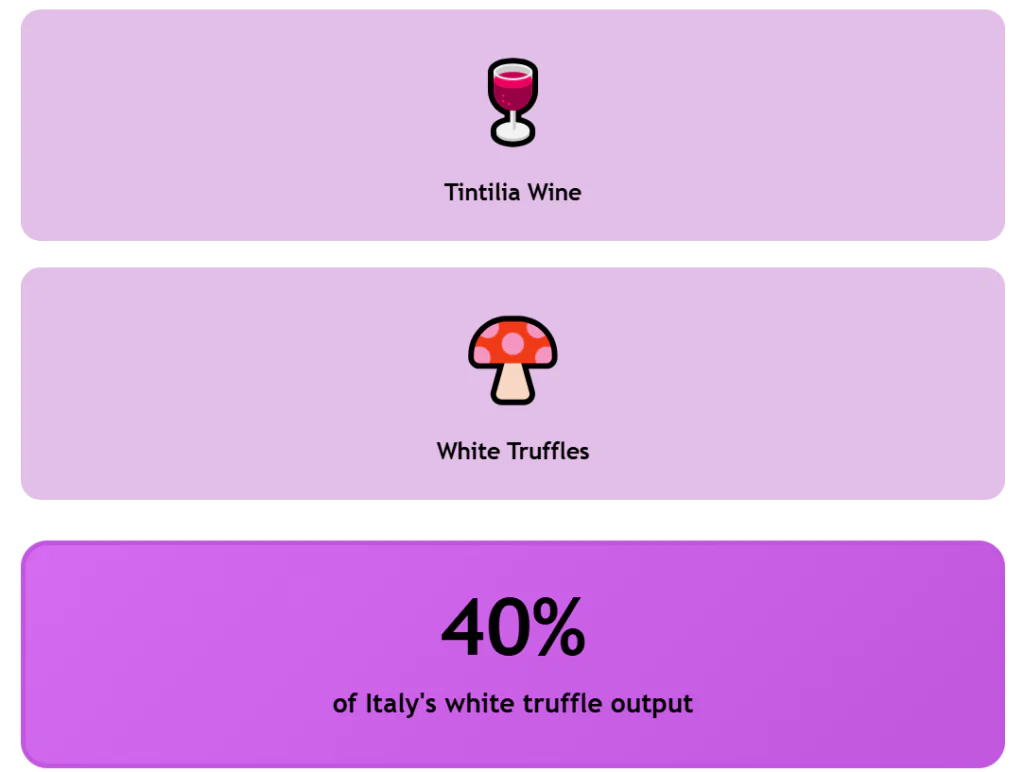 Vineyards with the native Tintilia grape give you a regional wine with a clear identity. On top of that, Molise accounts for about 40% of Italy’s white truffle production. So you have three high‑value products—olive oil, wine, and truffles—on the same map.