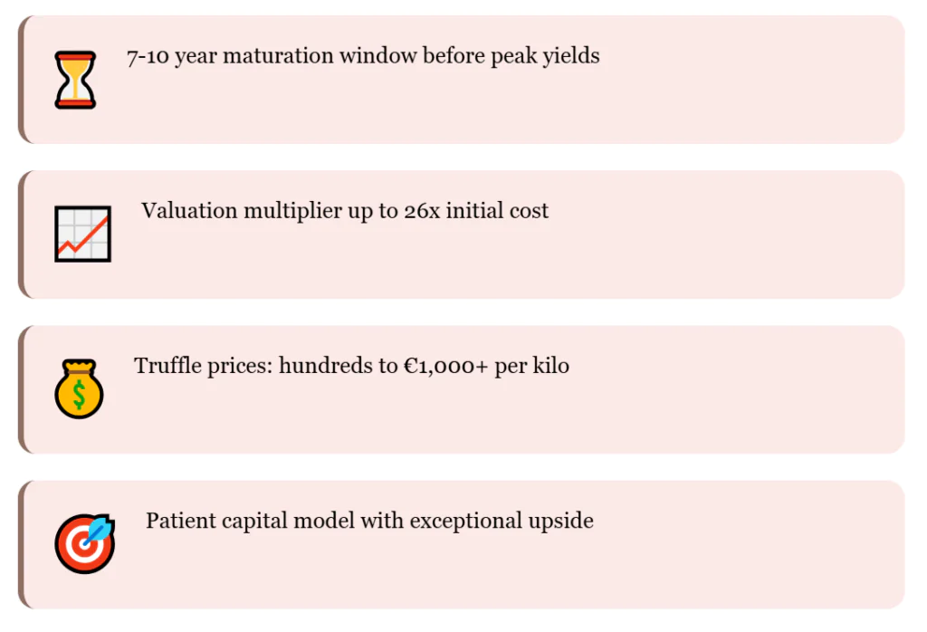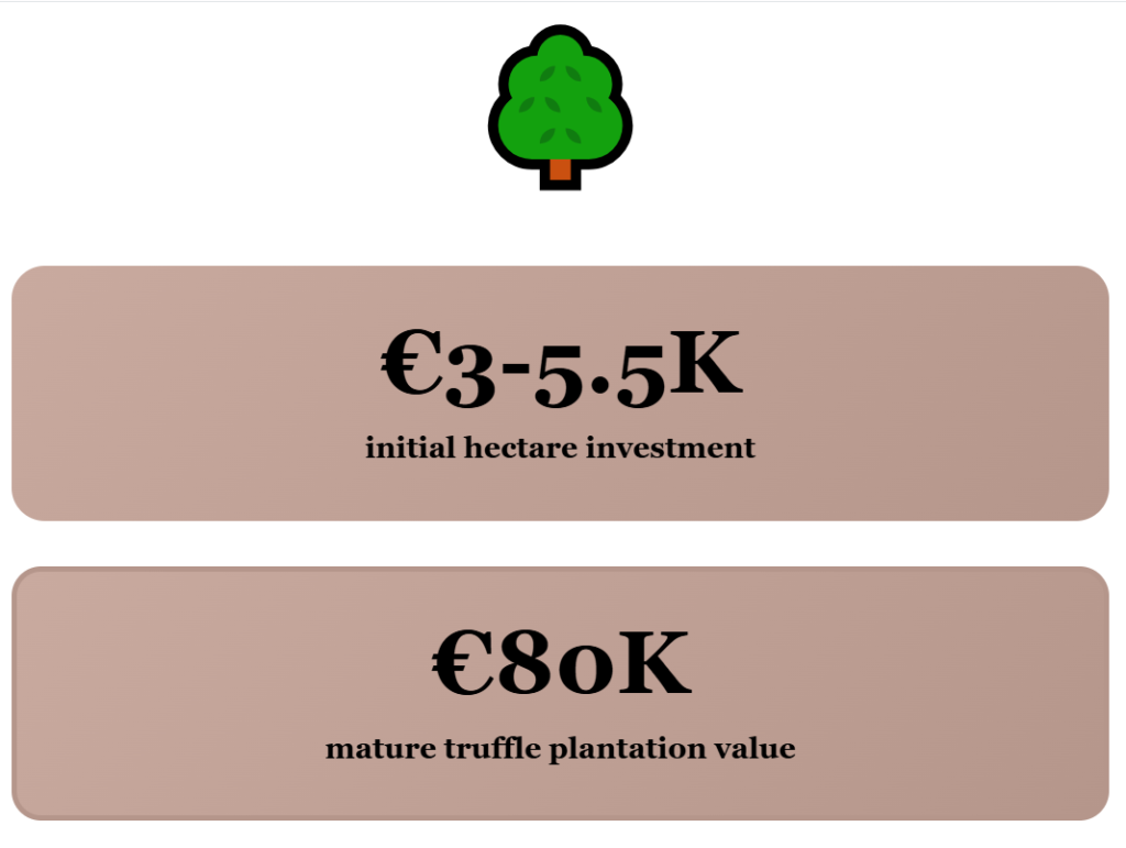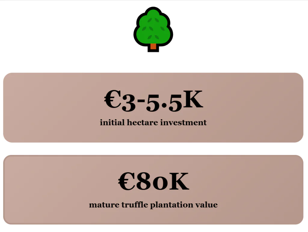 The payoff can be big. Once plantations reach full production, land values can rise to as high as €80,000 per hectare. Truffle prices often reach several hundred euros per kilo, and in some seasons go over a thousand.