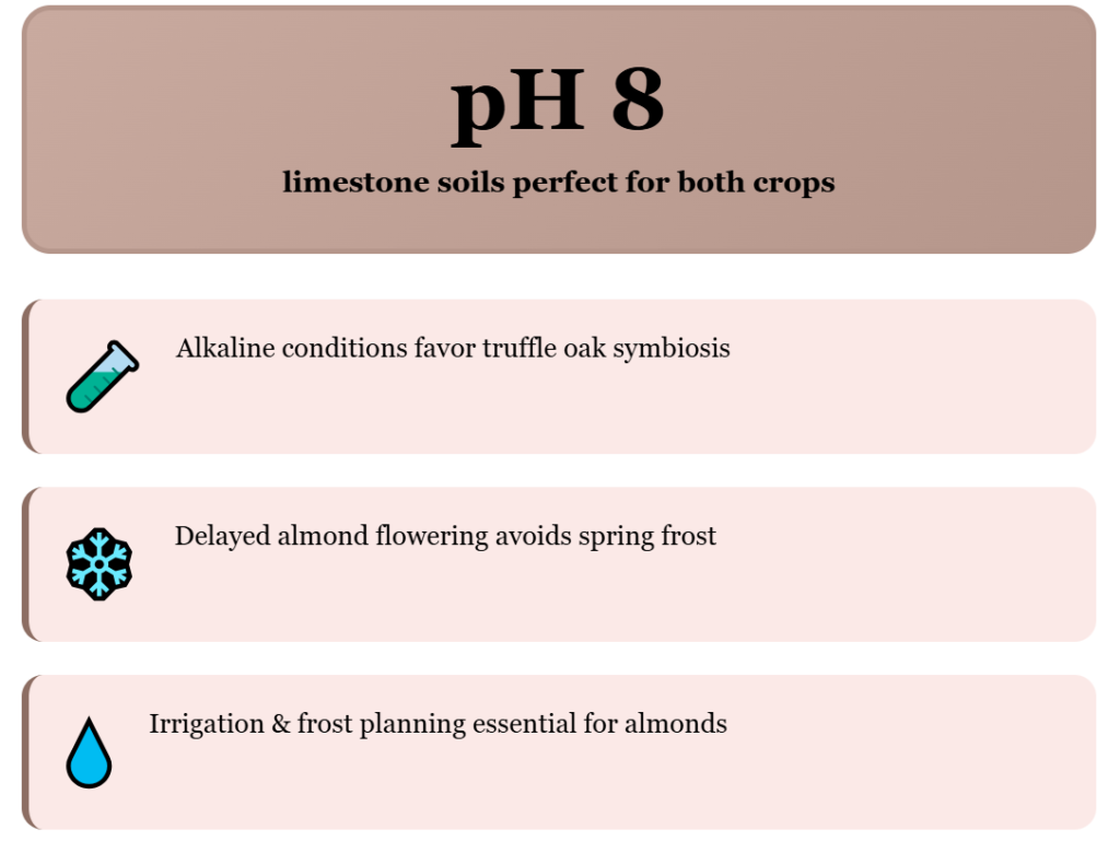 That mix is not good for soft crops, but it is ideal for two specific ones: black truffles and almonds. Black truffles, Tuber melanosporum, drive most of the upside. Truffle oaks need 7 to 10 years to reach peak production, so you put money down long before you see income.