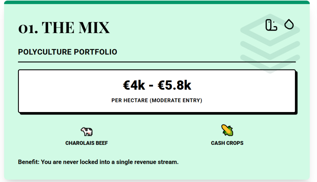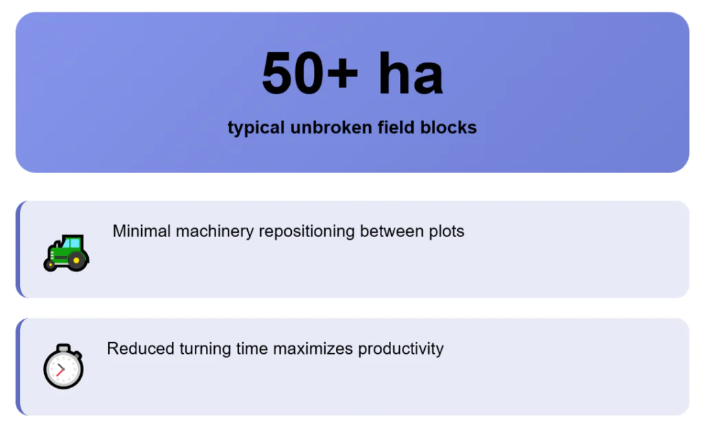 That matters because one tractor fleet and one worker can cover more ground with less wasted time turning around, moving machinery, or dealing with hedges and boundaries. Land there usually trades around €6,000 to €7,500 per hectare. It is not the lowest number in Europe, but you get central positioning.