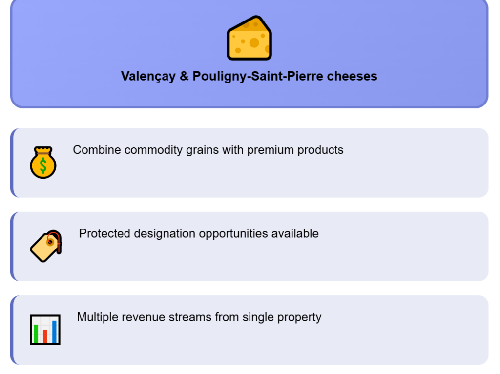 You are about 2.5 hours south of Paris by road, with direct access to the Rungis wholesale market, which is one of Europe’s key food hubs. Large cereal fields dominate, with wheat, barley, and rapeseed as the main crops. On top of that, you have goat dairy supplying cheeses like Valençay and Pouligny‑Saint‑Pierre, so you can combine grains with higher‑margin premium milk.