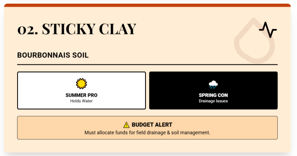 Bourbonnais clay holds water in summer but creates drainage and access issues in wet periods. In a rainy spring, heavy clay can delay field work, which affects planting windows and yields for arable crops.