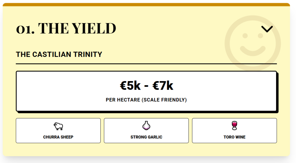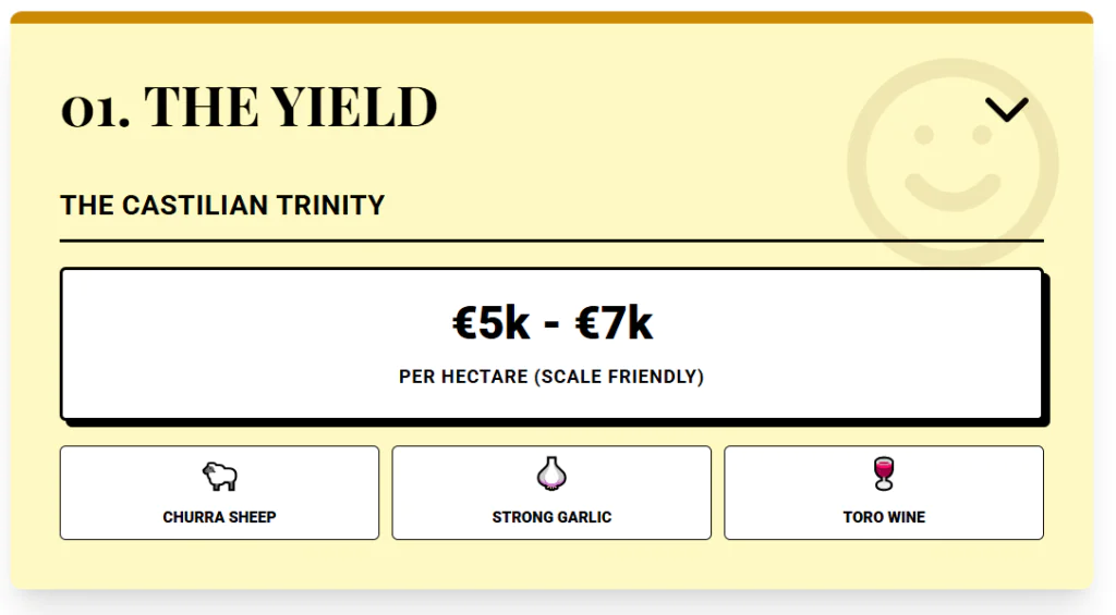 At that level, you can buy meaningful scale without going into city‑level budgets. Zamora has deep agricultural roots: Churra sheep for meat, wool, and milk used in local cheeses, strong garlic production and direct influence from the Toro wine area, known for powerful red wines. Inside the denomination, vineyard land costs more, but just outside you still find fields at the lower band.