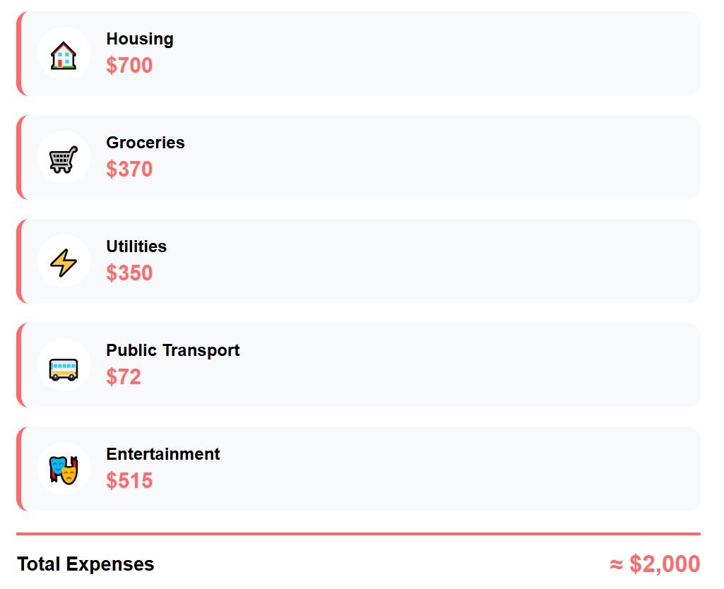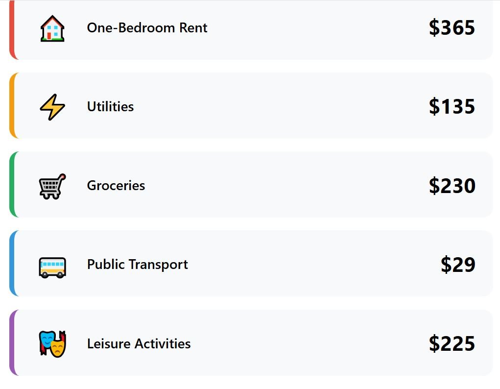 To answer this, I analyzed five key spending categories: rent for a one-bedroom apartment, utilities, groceries, public transport monthly passes, and entertainment.